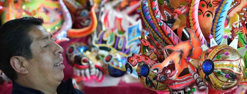 Dentro me reciben Germán Flores, una silenciosa doña Miriam Corrales y un perrito que, con sus tímidos ladridos ante presencia extraña, deambula por el taller. Respiro la carga de trabajo en estos últimos días previos a la celebración, porque Miriam Corrales, mientras la entrevisto, casi no levanta la vista de la máscara a la que está dando vida con una singular policromía. Es Germán Flores quien, amablemente, me dedica un valioso tiempo de su mañana para permitirme conocer mucho más sobre esta tradición artesanal que se resiste al «made in China».